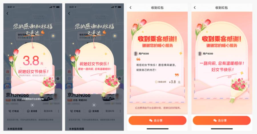 图为:乘客在滴滴App内为女司机送祝福和司机侧收到的祝福页面