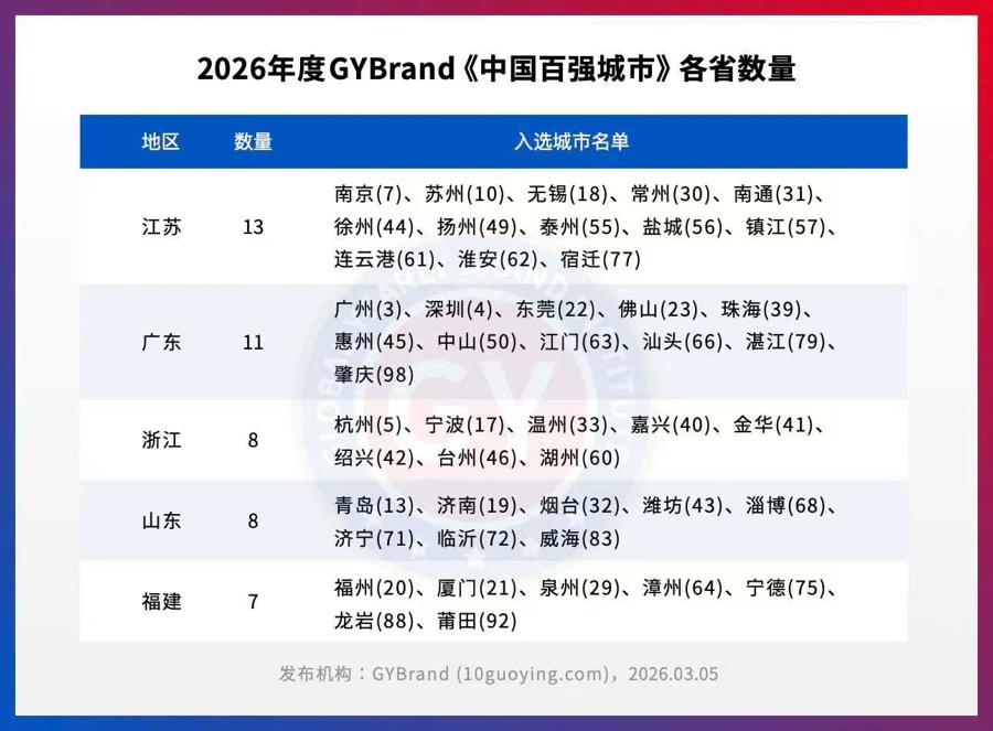 日前,城市指数研究机构GYBrand独家编制的《2026年度中国百强城市指数》发布。