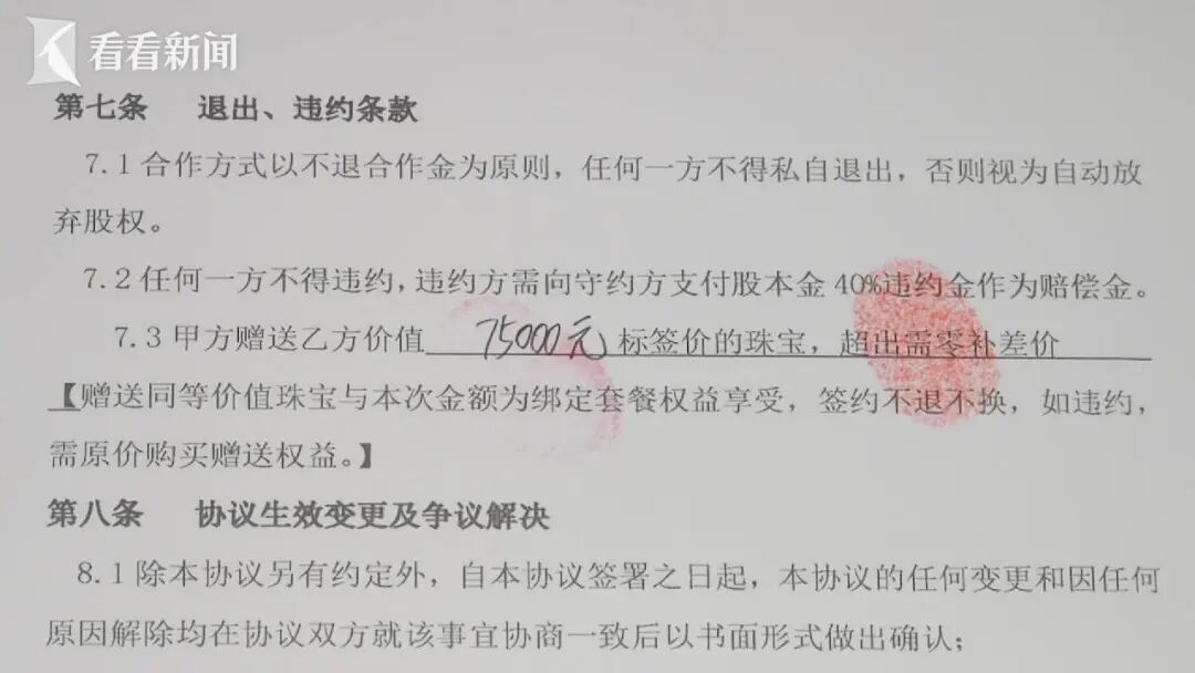 对此,商家反驳,收据上注明的“可自用消费”,其实是店家赠送给陆女士、用于支持她拓展客源的资源。合作协议书中还列出了陆女士作为合作方可享受的其他权益,比如,“140套价值8888元VIP尊享卡”、“价值75000元的珠宝”等,而这些“赠送权益”,实质上都是为了辅助她进行客户引流。
