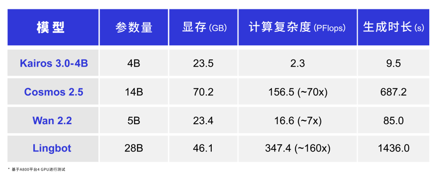 Kairos 3.0-4B 以4B轻量化参数实现23.5GB显存占用,与5B的Wan 2.2相当,远低于14B的Cosmos(70.2GB)和28B的Lingbot(46.1GB),在保持极致性能的同时,大幅降低部署门槛,完美适配具身智能端侧实时推理需求,打破“大参数=高性能”的行业固有认知。
