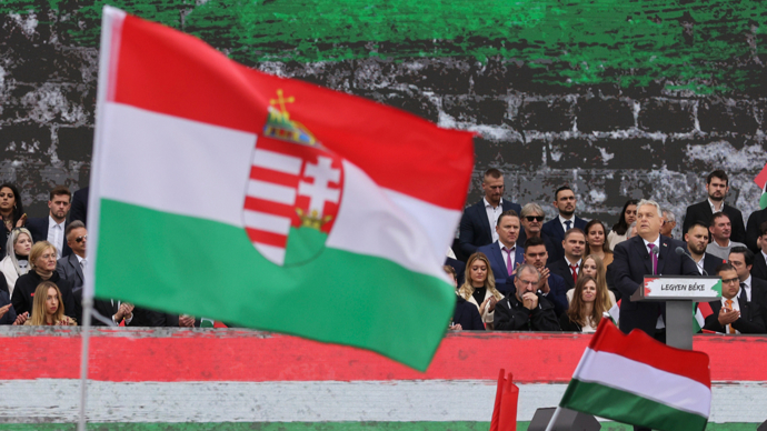 2025年10月23日,匈牙利总理欧尔班(前右)在首都布达佩斯举行的一场集会上讲话。