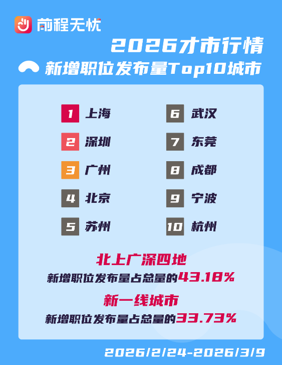 基于这一招聘黄金窗口,前程无忧51job剖析了2026年春节后的企业端招聘市场,数据显示,新增职位高度集中于核心城市群。四大一线城市与15个新一线城市合计占节后新增职位总量的76.9%。其中,上海的新增发布数稳居全国首位,长三角与珠三角核心引擎在跨国总部、科创及高端服务业的用工基本盘依然稳固。