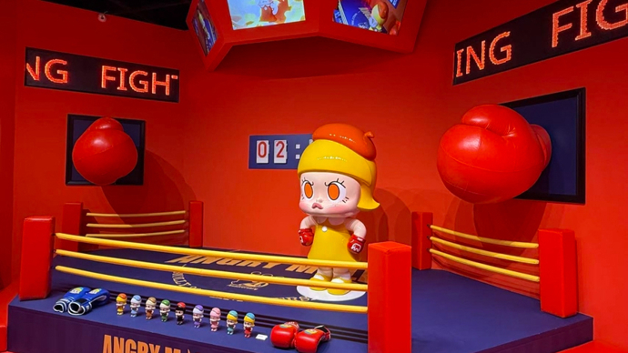 本次特展中最有趣味的部分,则莫过于Baby Molly、Angry Molly、SPACE MOLLY等不同形象与角色的主题展厅。通过搭建出一个个风格迥异的沉浸式场景,主题展厅不仅诠释着不同MOLLY形象所代表的想象、童真、勇敢与守护等精神内核,也为观众提供了打卡“出片”的绝佳机位。如Baby Molly展厅布置了巨型书桌,观众仿佛走进了小人国;Angry Molly展厅设置了拳击擂台,还贴心地提供了拳击手套,观众可以上台和Molly“切磋”一番。SPACE MOLLY展区则布置成了深邃的星际,还展出了首个“冲出地球”的手办——去年,一个银色镀面的MOLLY随谷神星一号运载火箭进入太空,今年又搭乘力鸿一号遥一飞行器返回,成为首个实现太空往返的原创潮玩IP。