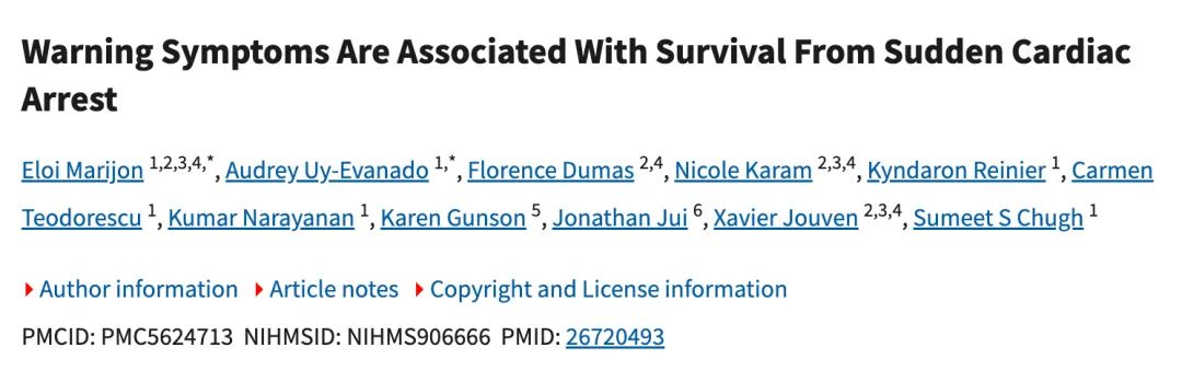2016《内科学年鉴》刊发的一篇文章,首次大规模证实心脏骤停前存在可识别的预警症状,打破了“猝死毫无征兆”的传统认知。研究纳入的839名心脏骤停患者中,430名有先兆症状,占51%,主要为:胸痛、呼吸困难、头晕。