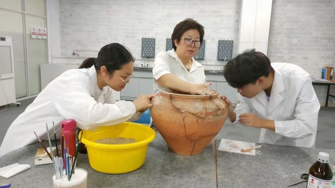 美术与文物保护学院杨蕴教授带着学生,为金华博物馆修复东汉印纹硬陶罐