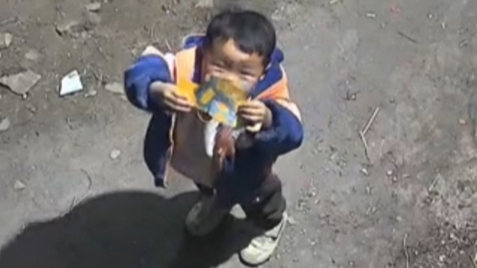 留守儿童看到别人家的爸爸买的玩具,他默默捡了包装纸,回家后,举到镜头前,对另一端的爸爸说:“给我买一个吧。”