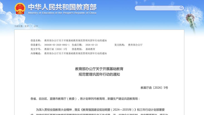 今天(27日),教育部发布《关于开展基础教育规范管理巩固年行动的通知》(以下简称《通知》),将围绕教育公平、日常管理、办学治校、校园安全、教育生态五大核心方面开展专项巩固行动,持续规范基础教育办学行为。