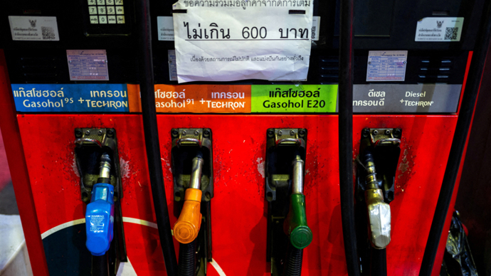 这是3月26日在泰国曼谷的一家加油站拍摄的燃油限售标识。