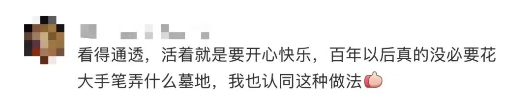 老人还说,活着的时候开心最重要,墓地那些都是做给别人看的,留在心里纪念就好了。墓地买得好就代表孝顺吗?活着时孝顺时才重要。“如果真的到了生命结束的那一天,墓地不是必需品,撒向大海,我最欢喜了”。