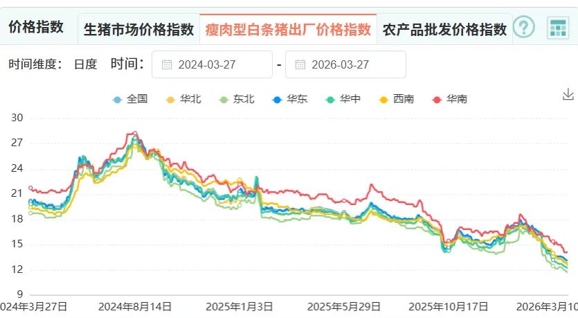 农业农村部全国重点农产品市场信息平台数据显示,截至3月27日,瘦肉型白条猪出厂价格指数已降至2024年同期以来新低。