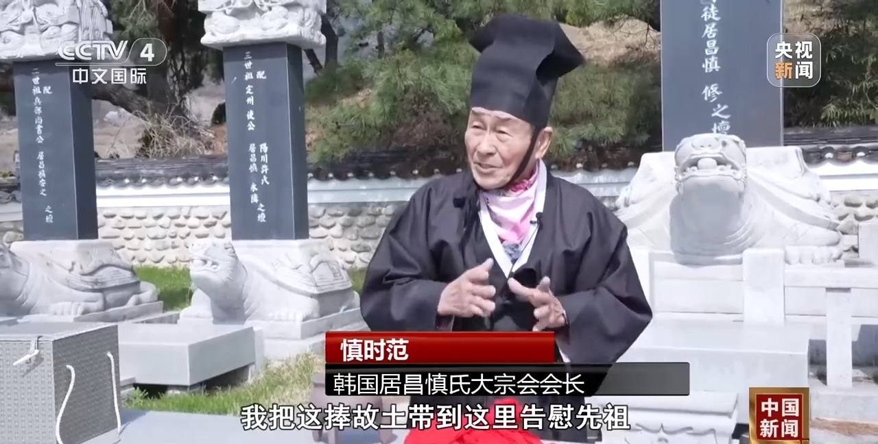 韩国居昌慎氏大宗会会长 慎时范:我把这捧故土带到这里告慰先祖。中国亲人送给我们一幅字,上书“同源同宗 守望相助”,我们来自同样的根,更应承先祖庇佑、携手同行。