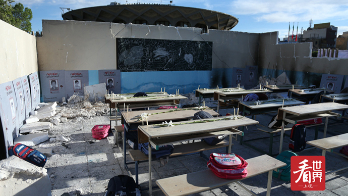 4月6日,在伊朗首都德黑兰市举行的悼念活动现场,组织者搭建起小学教室遭袭场景,悼念遭美以空袭遇难的米纳卜小学学生。 新华社记者 沙达提 摄