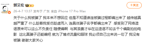 4月7日,郭艾伦发文否认被骗:关于什么我被骗了,我本来不想回应,但是不知道谁连被骗过程都编出来了,越传越真越严重了。什么趁着我受伤趁虚而入,连具体骗子名字都编出来了,感受到了网络造谣原来可以这么不负责任,随便编啊。与其浪费才华在这造谣不如去干个编剧拍拍电影,这比真骗子还能编吧,就为了博点流量和眼球,我必须自己出来说一句了,我没有被骗,谢谢大家关心。