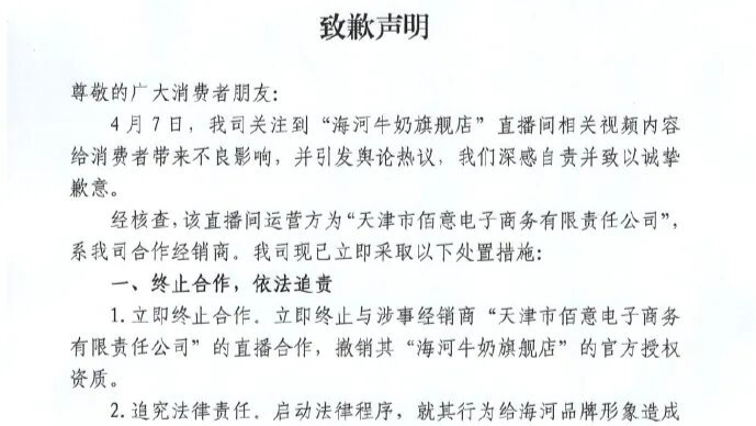4月8日,天津海河乳品有限公司发布致歉声明称,公司关注到“海河牛奶旗舰店”直播间相关视频内容给消费者带来不良影响,并引发舆论热议,公司深感自责并致以诚挚歉意。经核查,该直播间运营方为“天津市佰意电子商务有限责任公司”,系公司合作经销商。