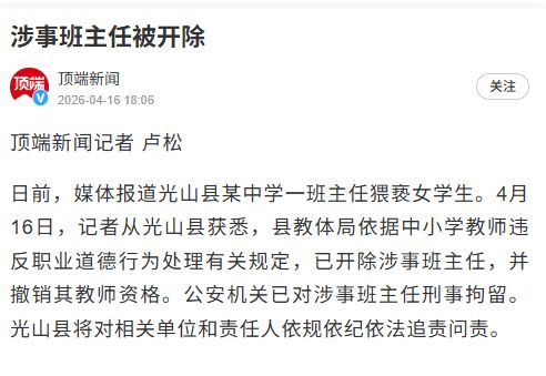今天(4月16日),记者从光山县获悉,县教体局依据中小学教师违反职业道德行为处理有关规定,已开除涉事班主任,并撤销其教师资格。公安机关已对涉事班主任刑事拘留。光山县将对相关单位和责任人依规依纪依法追责问责。