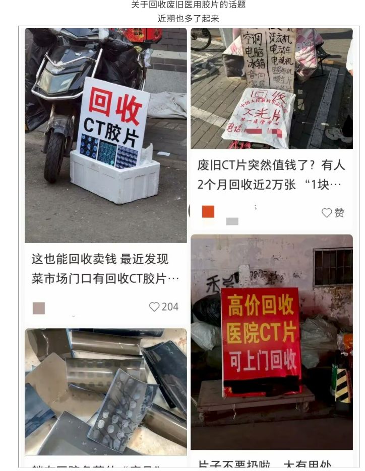 近期,在一些二手交易平台上,出现了不少收购废旧医用胶片的信息。有人主动出售:“71张,200元包邮。”这些原本记录患者骨骼、器官影像的CT片、X光片,正在被买家批量收购。