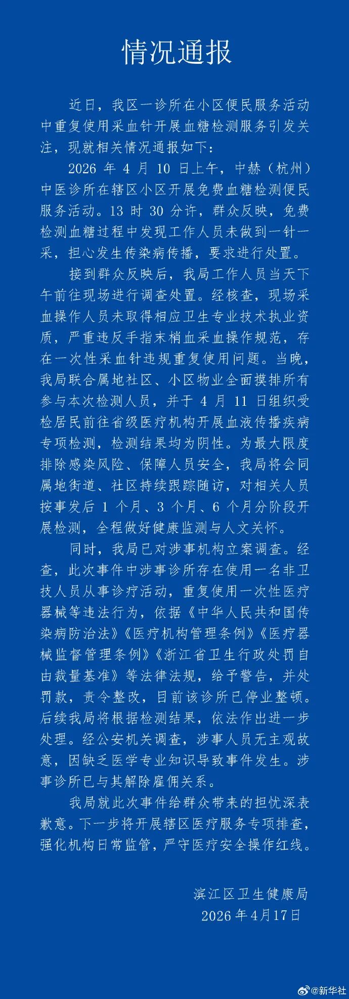 2026年4月10日上午,中赫(杭州)中医诊所在辖区小区开展免费血糖检测便民服务活动。13时30分许,群众反映,免费检测血糖过程中发现工作人员未做到一针一采,担心发生传染病传播,要求进行处置。