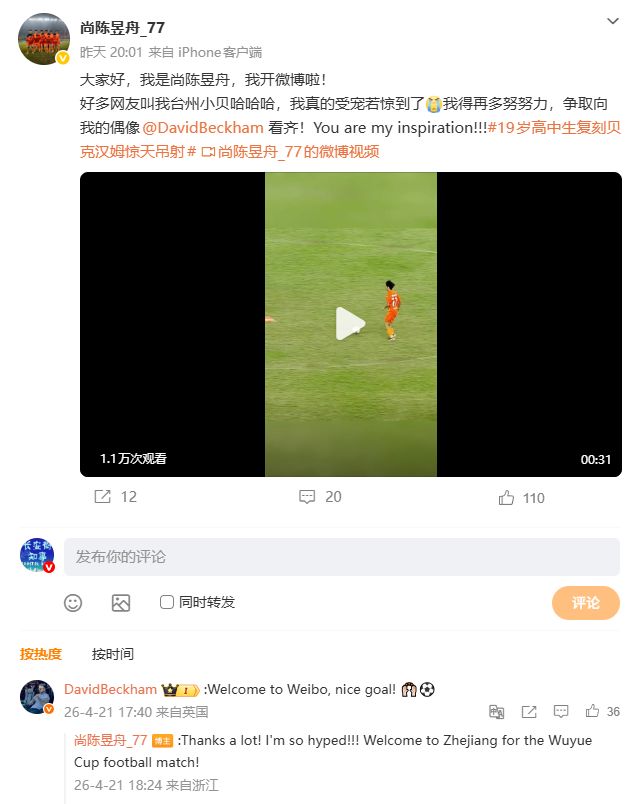 4月20日,尚陈昱舟开通微博并发文表示“我得再多努努力,争取向我的偶像贝克汉姆看齐!”次日下午,贝克汉姆在评论区回应:Welcome to Weibo, nice goal!(欢迎开通微博,漂亮的进球!)