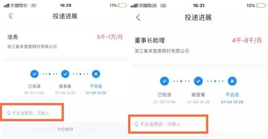 让她感到意外的是,7月4日,她收到了前一天简历投递的结果。投递进展显示,简历“被查看”后,一分钟之内浙江喜来登度假村有限公司便给出两个“不合适”的通知。不合适原因后面,写着三个灰色小字:河南人。