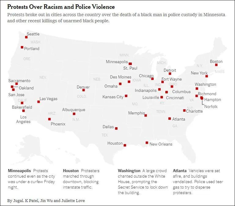 近日,美国明尼苏达州白人警察涉嫌暴力执法致死黑人男子乔治·弗洛伊德,由此引发的示威活动持续发酵,已至少波及了美国22个州的32个城市。