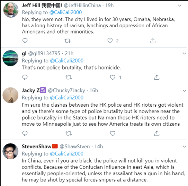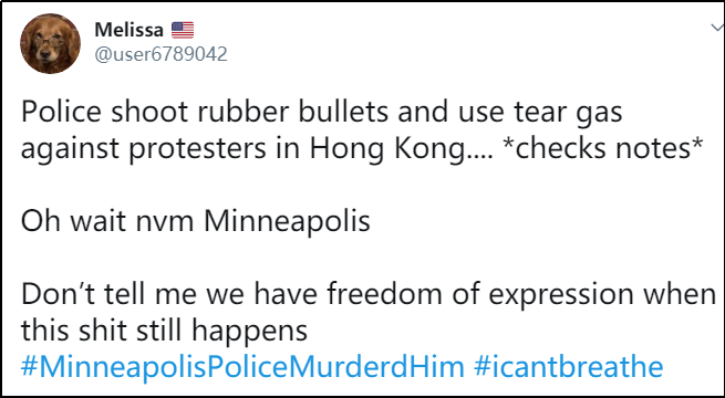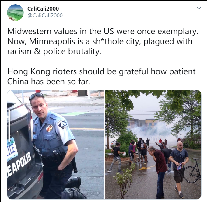 黑人惨死事件及后续骚乱发生后,一个来自美国加州的网友谴责了明尼苏达州警方的暴行,然后不由得感叹:“香港示威者应该感到庆幸,到目前为止,中国(香港警察)表现得多么有耐心!”