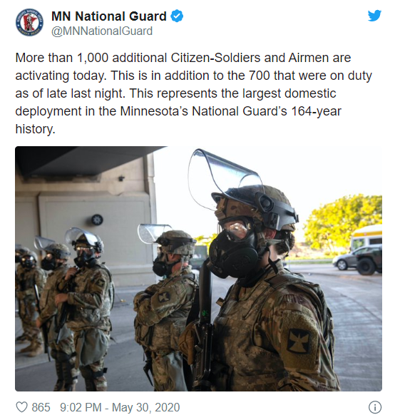 不过,当地时间30日晚,明州国民警卫队通过推特宣布,当天,该州又新增部署超过1000名士兵。明州国民警卫队少将詹森表示,至周末将共计派出超1700名士兵。明州州长在新闻发布会上称,这是该部队建队164年来,当地最大规模部署行动。