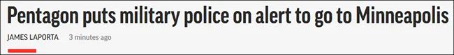 美联社称,五角大楼采取罕见措施,命令军警随时做好部署到明尼阿波利斯的准备。这一消息来自三名未透露姓名的知情人士。他们称,这是一项口头命令,在明尼阿波利斯发生抢劫和纵火事件后,特朗普要求国防部长埃斯珀做好军事准备。