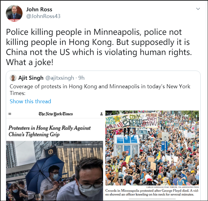 英国著名学者罗思义也发布了推文,认为“对比明尼苏达州和香港的情况后,是明尼苏达州警方在杀人、在侵犯人权,而不是香港。”