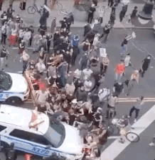 无独有偶,当地时间5月30日,纽约警车在遭抗议者围堵后冲撞人群。视频显示,示威者把隔离栏挪到一辆警车前,并向其投掷物品。随后,第二辆警车驶来,两辆警车几乎同时冲撞示威者,顶人前行。