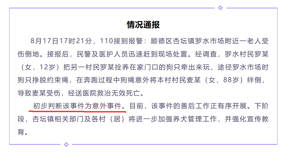 8月17日,罗水村民罗某(女,12岁)把另一村民罗某拴养在家门口的狗只牵出来玩,途经罗水市场时狗只挣脱约束绳,在奔跑过程中狗绳意外将本村村民麦某(女,88岁)绊倒,导致麦某受伤,经送医院救治无效死亡。初步判断该事件为意外事件。