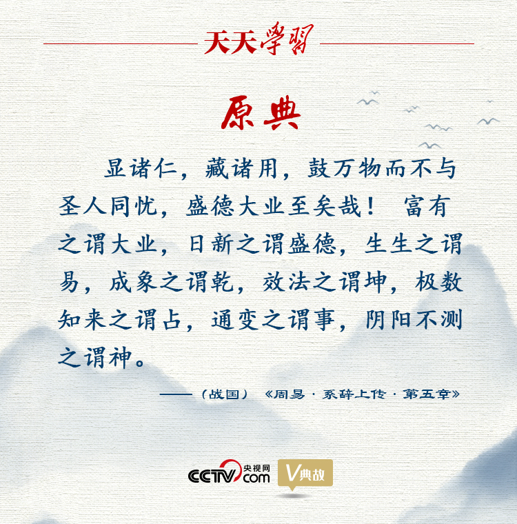 上述讲话中引用的“富有之谓大业,日新之谓盛德”出自《周易·系辞上传》,意思是:广泛创造物质财富和精神财富叫做弘大功业,持续永远的日日增新叫做盛美德行。
