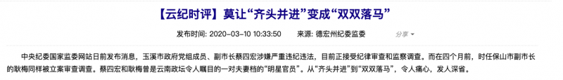 今年3月,云南省纪委监委官网发布了《莫让“齐头并进”变成“双双落马”》的文章。