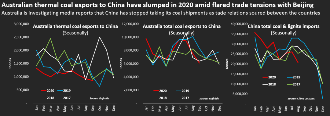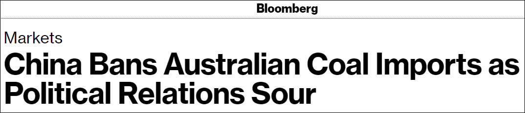 而彭博社则更为直接,报道援引不具名知情人士的消息称,由于中澳两国之间政治关系的恶化,中方将继续严格控制澳大利亚煤炭的进口,且已暂停购买澳大利亚煤炭。