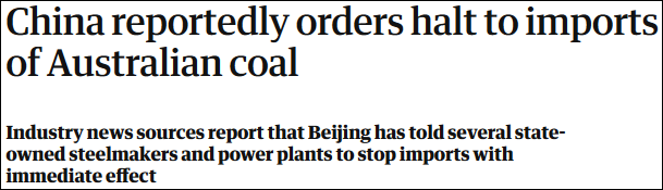 当天,英国《卫报》和美国彭博社都作出了报道。《卫报》援引两家行业媒体的消息源称,部分中国国有钢铁企业和发电厂已收到相关通知;而彭博社声称,此举是因“中澳政治关系的恶化”所致。