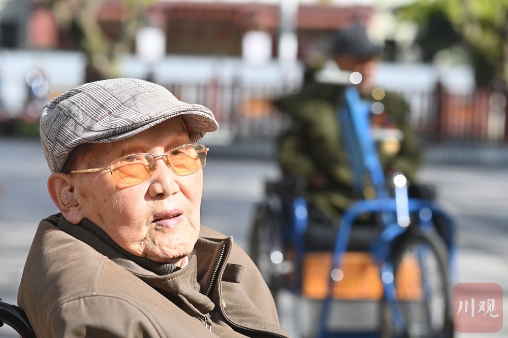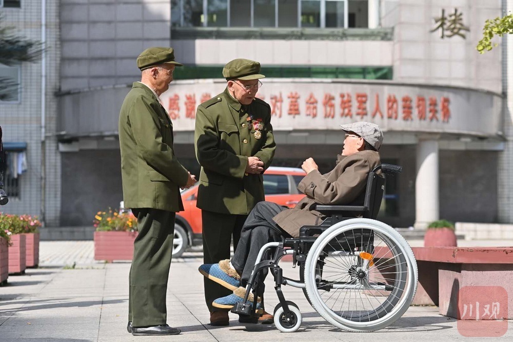 10月21日,阴雨多日的成都终于放晴,记者来到坐落在新都区新繁镇荣军路86号的四川省革命伤残军人休养院。这里绿树成荫、环境幽静,荣军休养楼前面的大坝子上,常年在这里休养的老兵们或坐轮椅,或杵拐杖,三三两两聊天、晒太阳。
