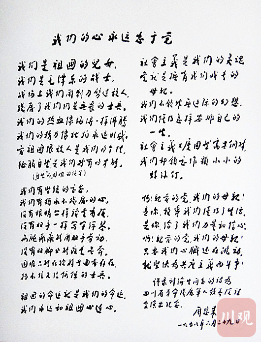 周恩来总理亲笔抄录《我们的心永远忠于党》 。四川省地方志工作办公室 成都市新都区地方志编辑委员会办公室提供