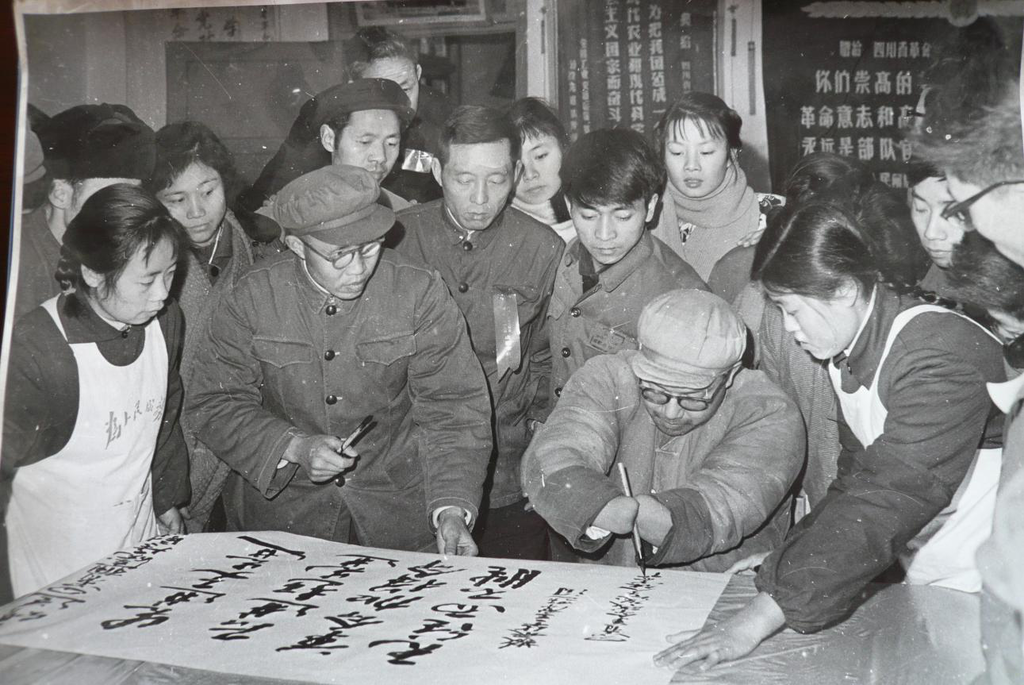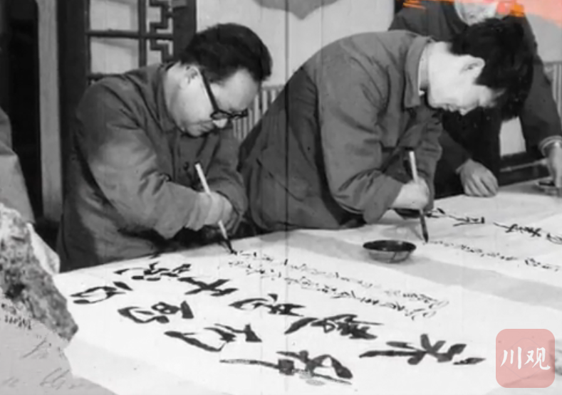 上世纪50年代,一级残疾军人周全弟表演抱笔书法。
