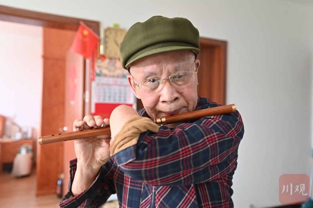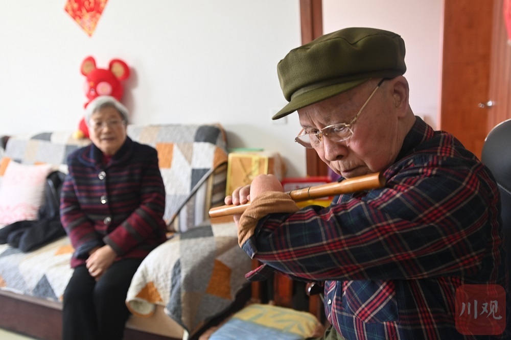 “老涂跳舞,我给他伴奏。”说起涂伯毅曾经的演出,一旁的汤重稀竖起了大拇指。85岁的汤爷爷在朝鲜期间,以手风琴为武器,鼓舞战士打击敌人,两次荣立军功。1953年1月,他在转战途中负伤,致右手截肢、右眼失明。1958年到四川省革命伤残军人休养院工作后,他以坚韧不拔的毅力潜心音乐创作,在省级以上刊物发表歌曲230多首。他克服了截肢的不便,练就了倒背手风琴、用左手演奏乐曲的绝技,被吸收为中国音乐家协会会员。