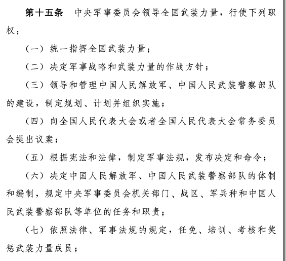 修订草案第15条明确,中央军事委员会领导全国武装力量,行使下列职权: