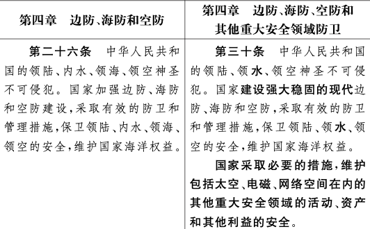 现行法第四章的名称是“边防、海防和空防”,修订草案的第四章是“边防、海防、空防和其他重大安全领域防卫”。