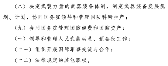 其中,第七个职权是,“与中央军事委员会共同领导民兵的建设和征兵工作以及边防、海防、空防和其他重大安全领域防卫的管理工作。”
