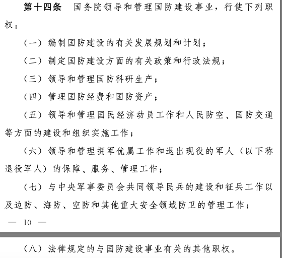 修订草案第14条明确,国务院领导和管理国防建设事业,行使八项职权: