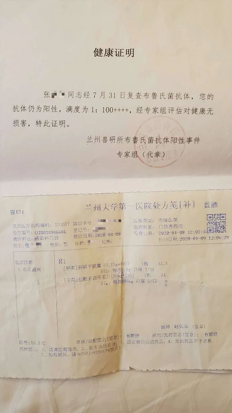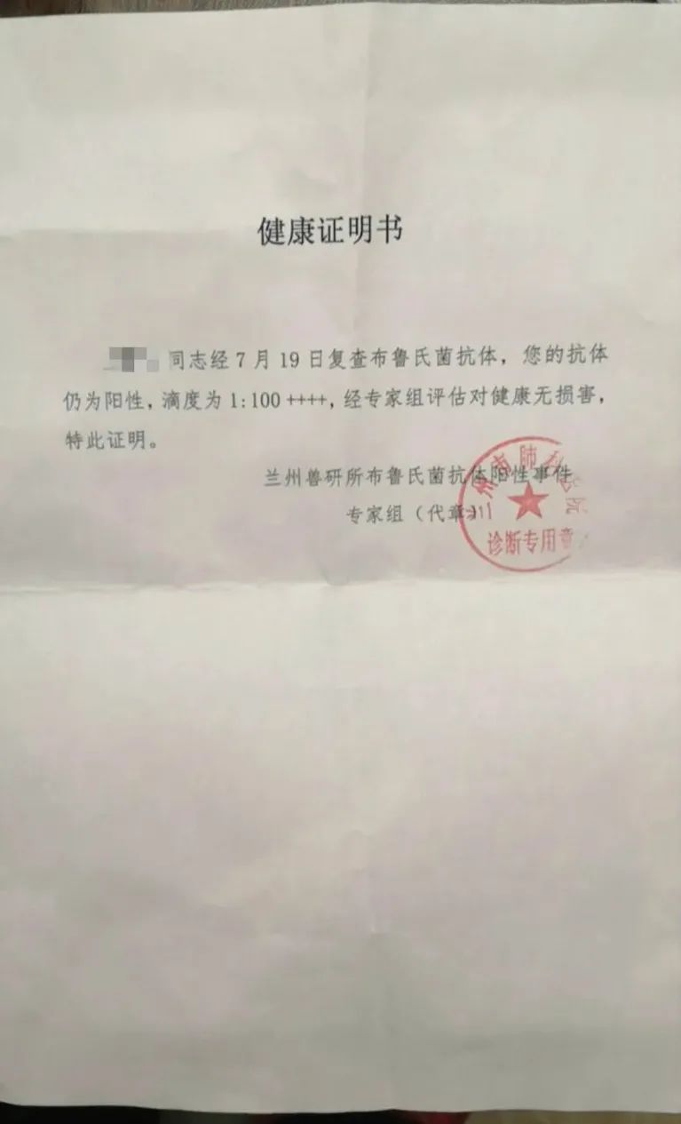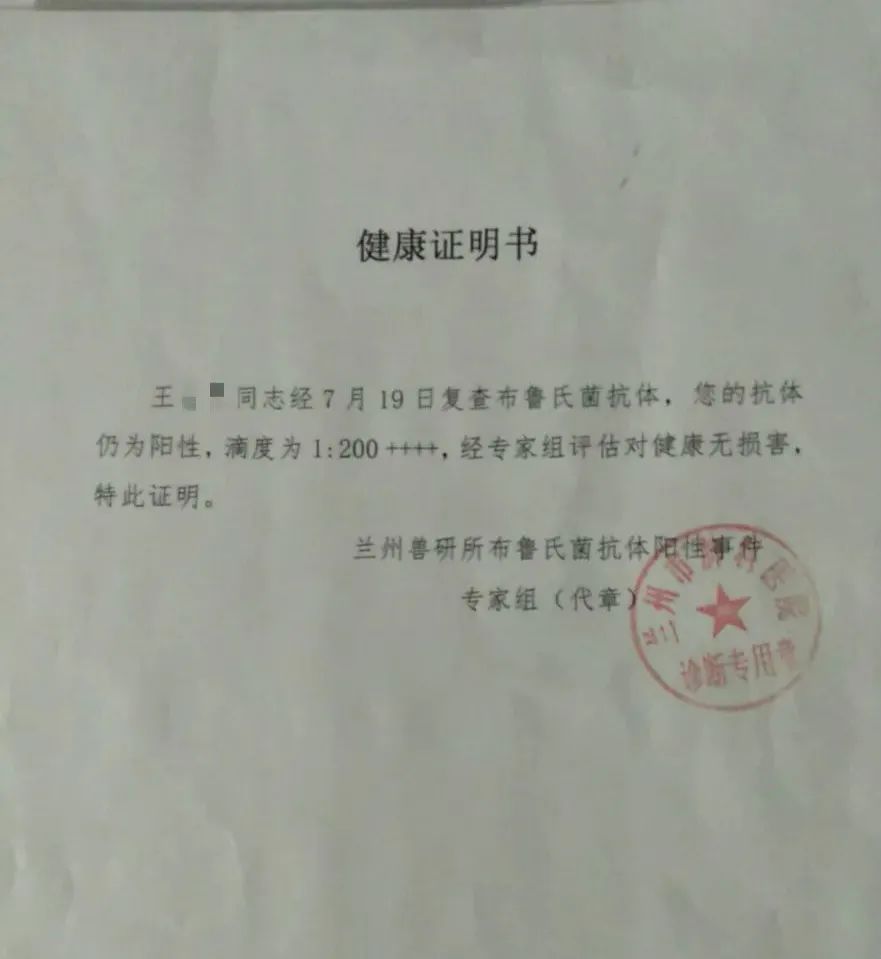 由兰州大学第一医院确诊为布病患者的张先生,也收到了和王女士一样的由兰州市专家组出具的《健康证明》,“经7月31日复查布鲁氏菌抗体,您的抗体仍为阳性,滴度为1:100+++,经专家组评估对健康无损害,特此证明”。