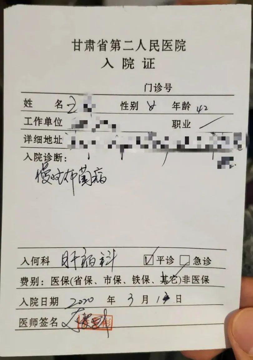 今年3月13日,王女士再次被甘肃省第二人民医院诊断为“慢性布鲁氏菌病”。在医院给王女士的住院证上,记者看到:“慢性布菌病,入肝病科,医师签名:李雯彬”。
