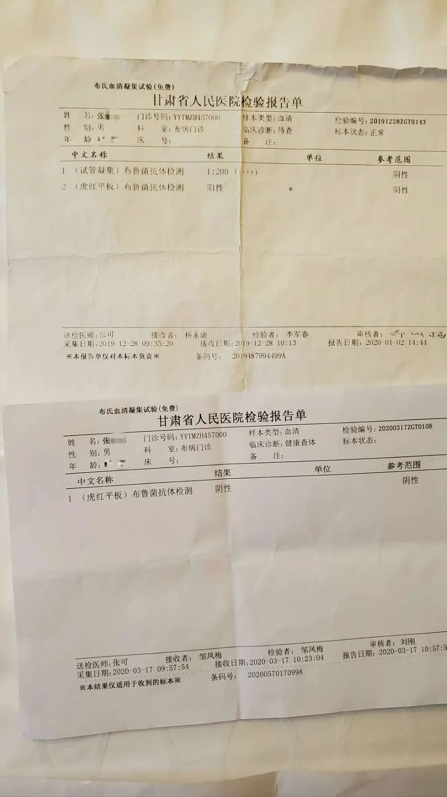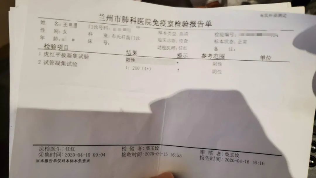 去年夏天在兰州生物药厂周边工作的许先生告诉记者,他在得知兰州生物药厂事件后,第一时间前往兰州市卫健委指定医院——甘肃省中医院进行检查,今年3月检测为阳性,而6月在兰州市肺科医院复查的结果为:试管凝集试验阴性、虎红平板凝集试验阳性,医生告诉他,“已经好了”。