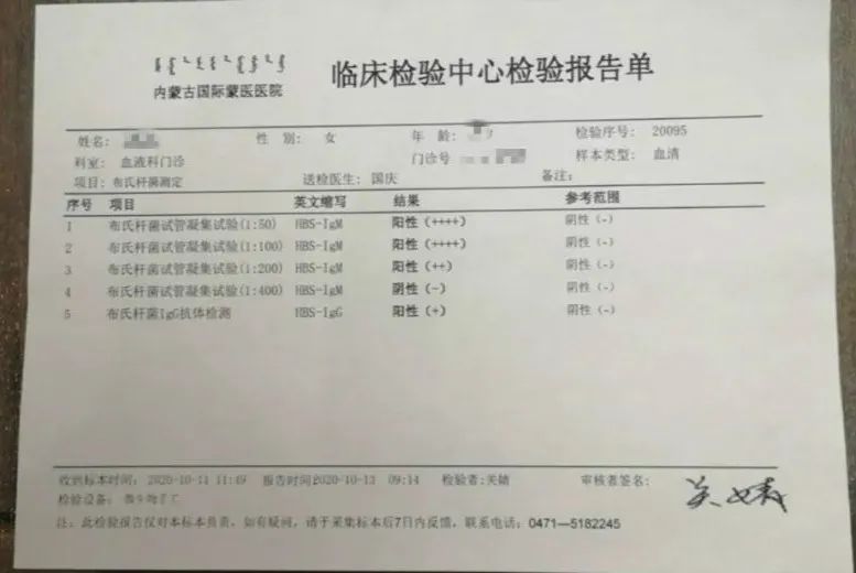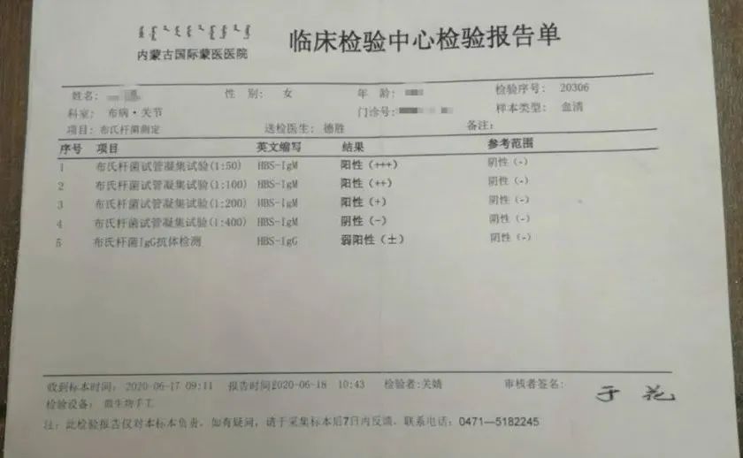因为布鲁氏菌病是人畜共患病,而内蒙牧区多、布病发病率相对高,治疗更加成熟,李女士今年6月去呼和浩特市的一家三甲医院——内蒙古国际蒙医医院的“布病·关节科”检查后,6月18日,主任医师德胜诊断李女士患有布鲁氏菌病。