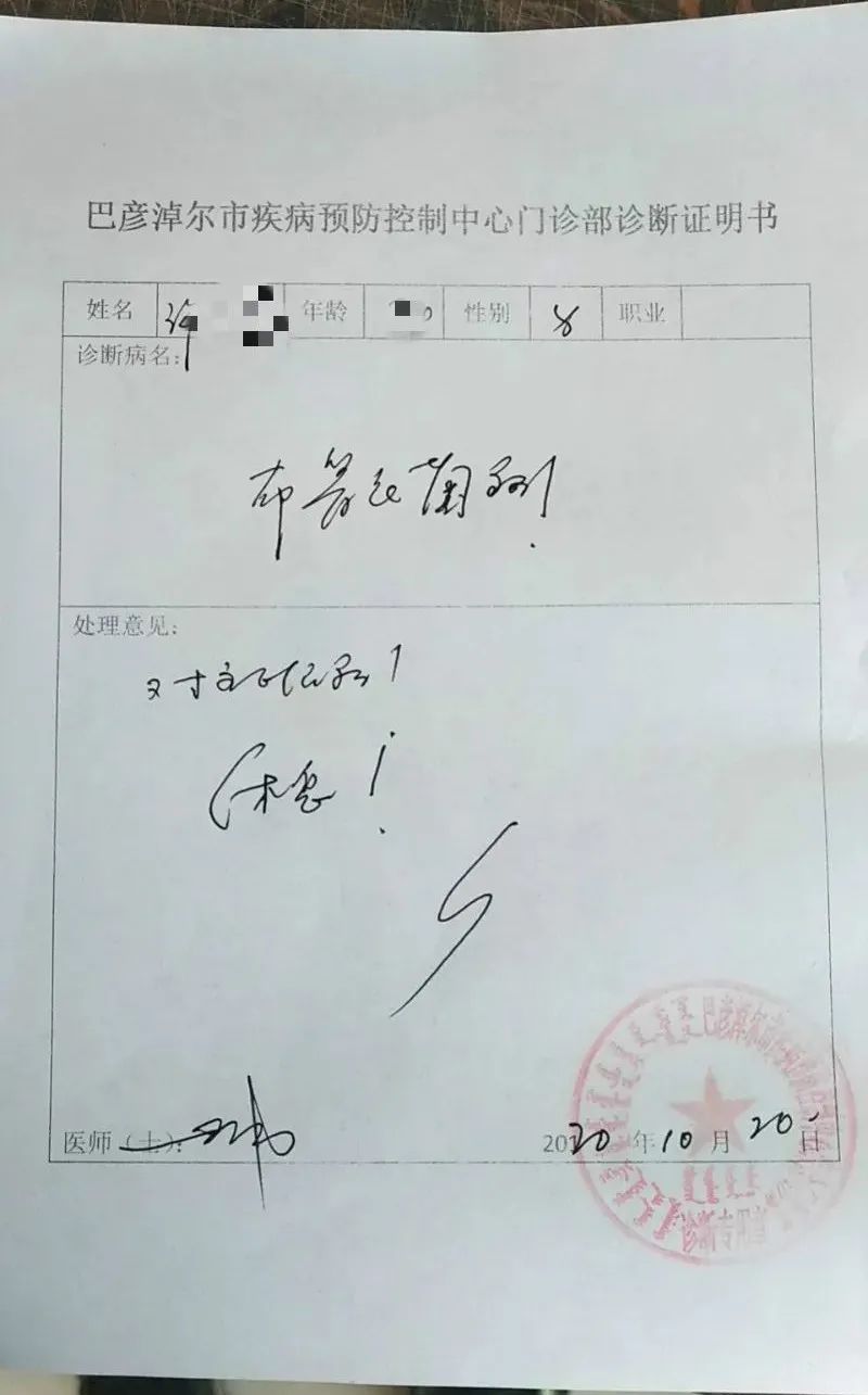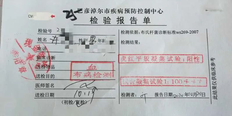 但仍有乏力、关节疼痛症状的许先生放心不下,今年10月前往内蒙古巴彦淖尔市疾控中心门诊部检查,10月20日,许先生的诊断结果出来了,和兰州肺科医院检测结果不同,他还是“双阳性”,在诊断书上记者看到:巴彦淖尔疾控中心门诊部医生罗建场,诊断许先生患有布鲁氏菌病,处理意见为休息、对症服药。