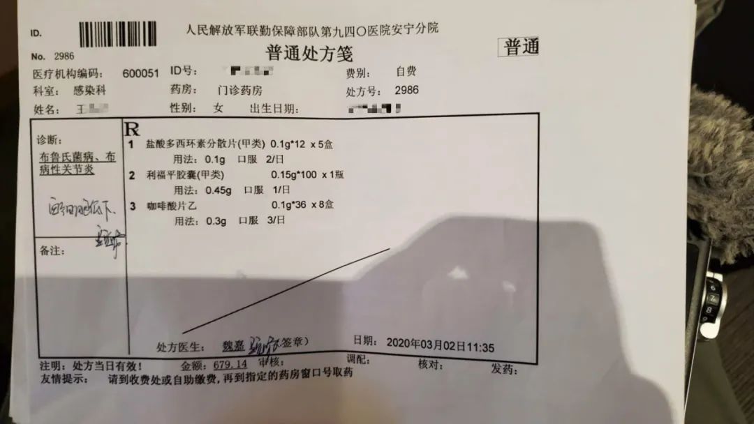 2020年3月2日,王女士被解放军940医院安宁分院诊断为“布鲁氏菌病、慢性布病关节炎、白细胞低下”。在医院给王女士的处方上,记者看到:“诊断:布鲁氏菌病、布病性关节炎、白细胞低下,处方为:盐酸多西环素分散片、利福平胶囊和咖啡酸片乙,处方医生魏嘉”。