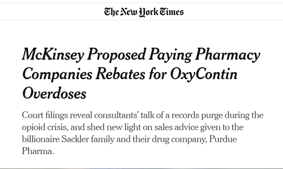 据此次曝料,作为普渡制药的管理咨询方,麦肯锡竟然曾经提出过多条恶劣的建议,让普渡制药谋求在美国的阿片药物滥用如此严重情况下继续增加“奥施康定”的销量。