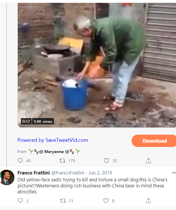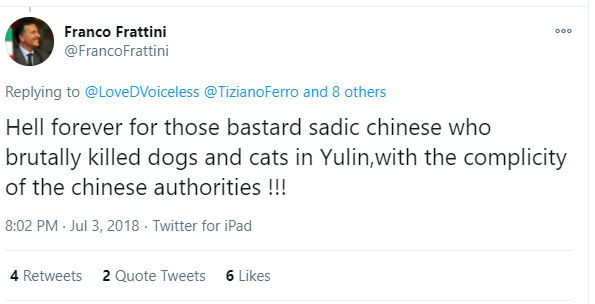 此人名叫franco frattini,是意大利的前外交部长。孙杨的律师发现,他曾多次在抨击中国的玉林吃狗肉的情况时,发表过种族主义言论。比如他在2018年8月时曾发帖称“那些杀狗的野蛮残忍的中国人都应该永远下地狱”,还曾在2019年6月2日称一名疑似在虐狗的中国男子为“残忍的黄皮肤”,并称西方国家在与中国打交道时应该记住中国这一残忍的形象。